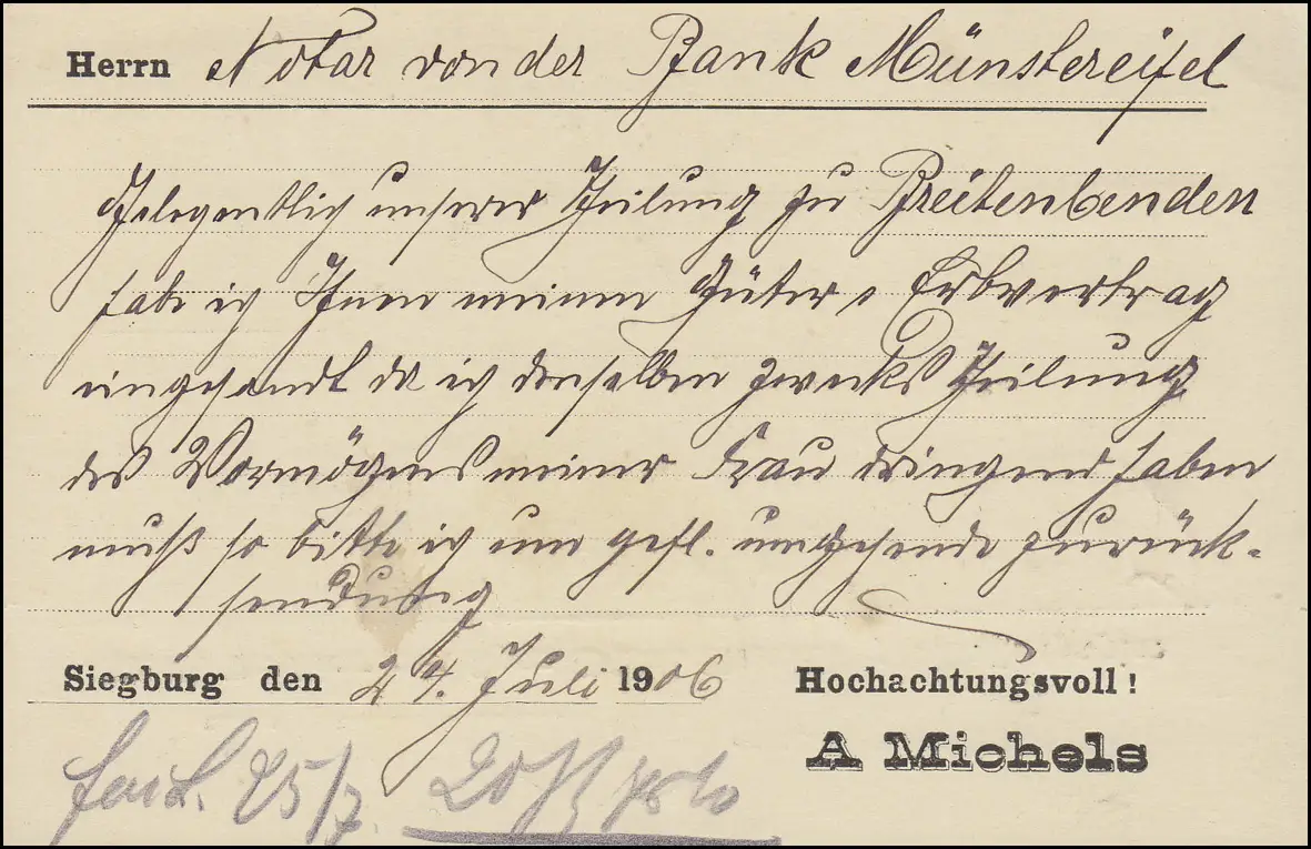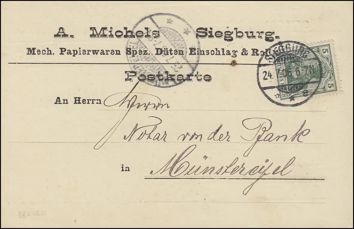 Germania 5 Pf. EF Carte postale Papierware Michels SIEBOURG 24.7.06 n. Münsterifell
