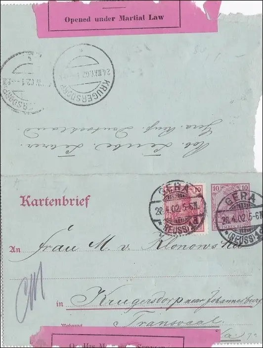 Germania: Lettre de Carte - Tout le dossier Gera vers Transvaal -Krüger Park 1902 - ZENSUR