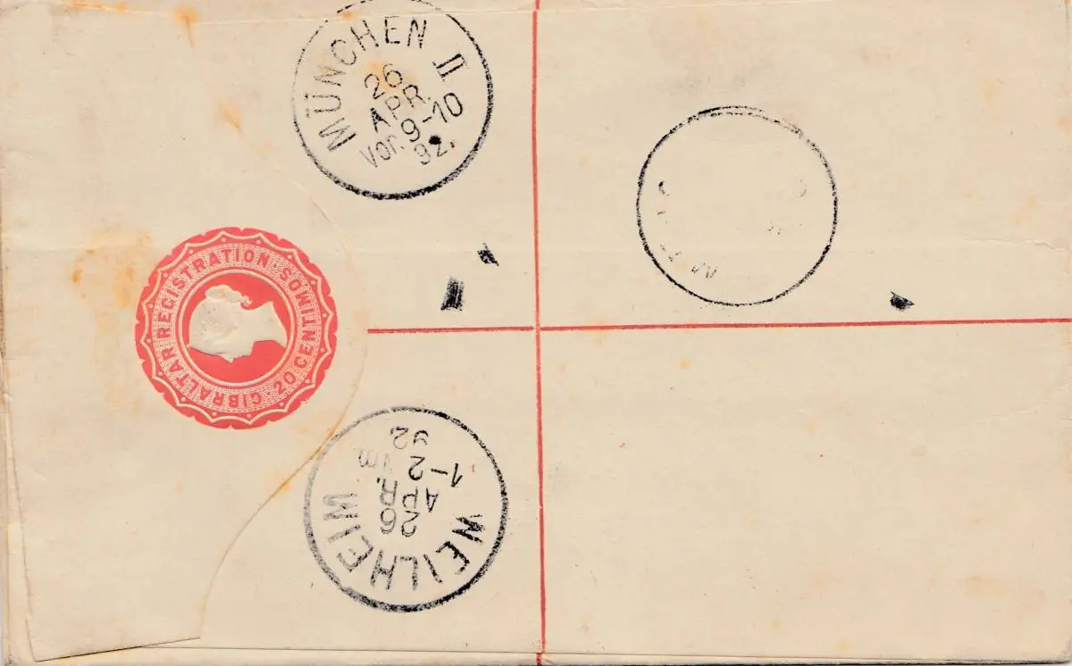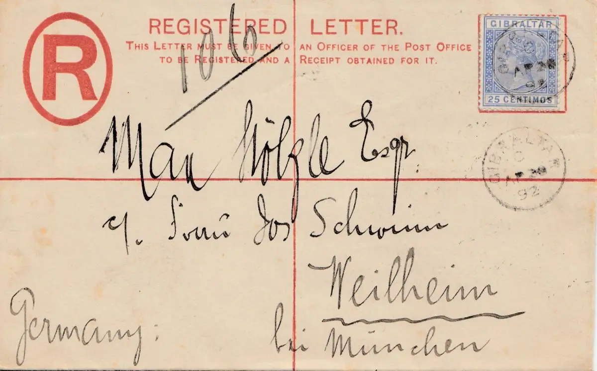 Gibraltar: 1892: Lettre pour Weilheim/München-Rescription