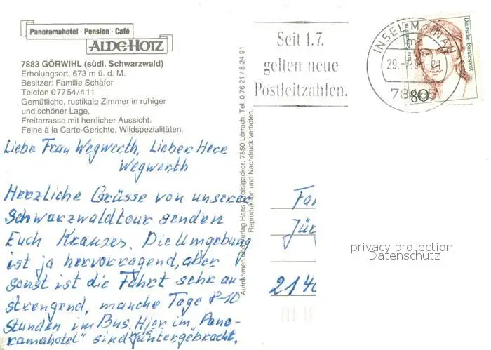 Goerwihl Panoramahotel Pension Café Alde Hotz Restaurant Wasserfall Schwarzwald Fliegeraufnahme Goerwihl postalisch gelaufen 1993 Erhaltung siehe scans [FriedD77] Frierer
