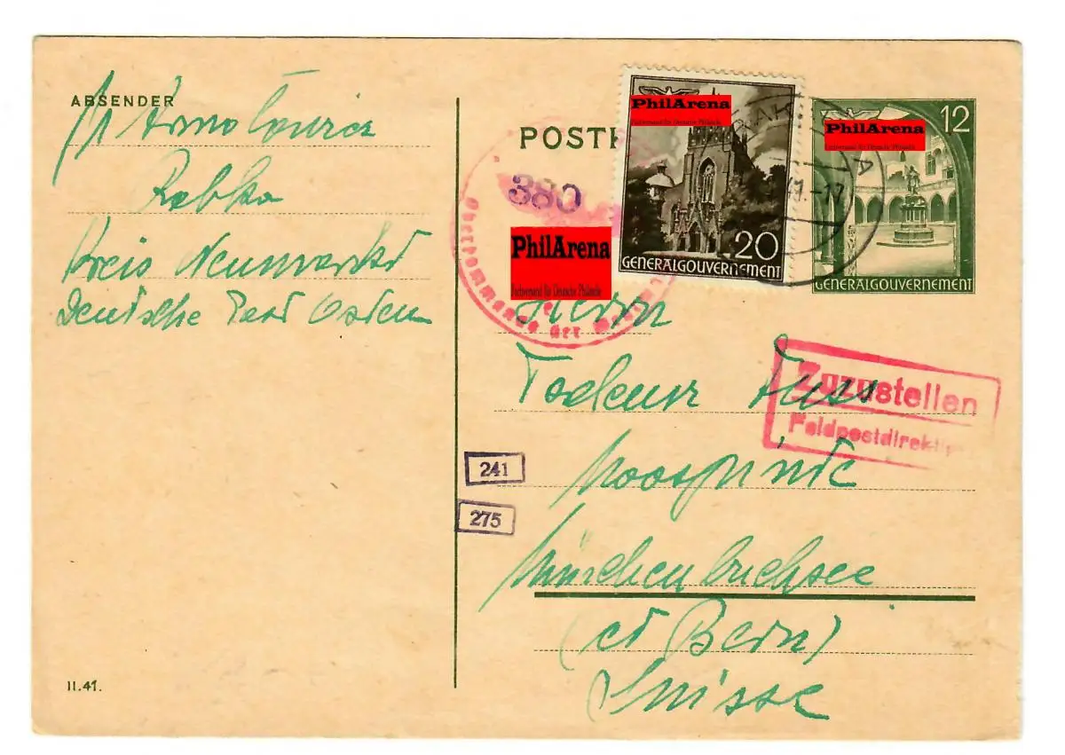 La campagne française de 1940 a permis à de nombreuses Polonais stationnées près de la frontière suisse de se rendre en Suisse et d'y entrer dans différents camps. Voici une affaire de Cracovie (distributeur Rabka) au camp de Munich-Buchsee en 1941. Censuration suisse par la direction des postes de terrain, censure allemande supplémentaire par le centre de contrôle des lettres étrangères et2 cachets d ' examinateur. Pour plus d ’ informations, voir Scan Numéro d\'article: 954584 Vérification: original Numéro de l\\article & #39954585