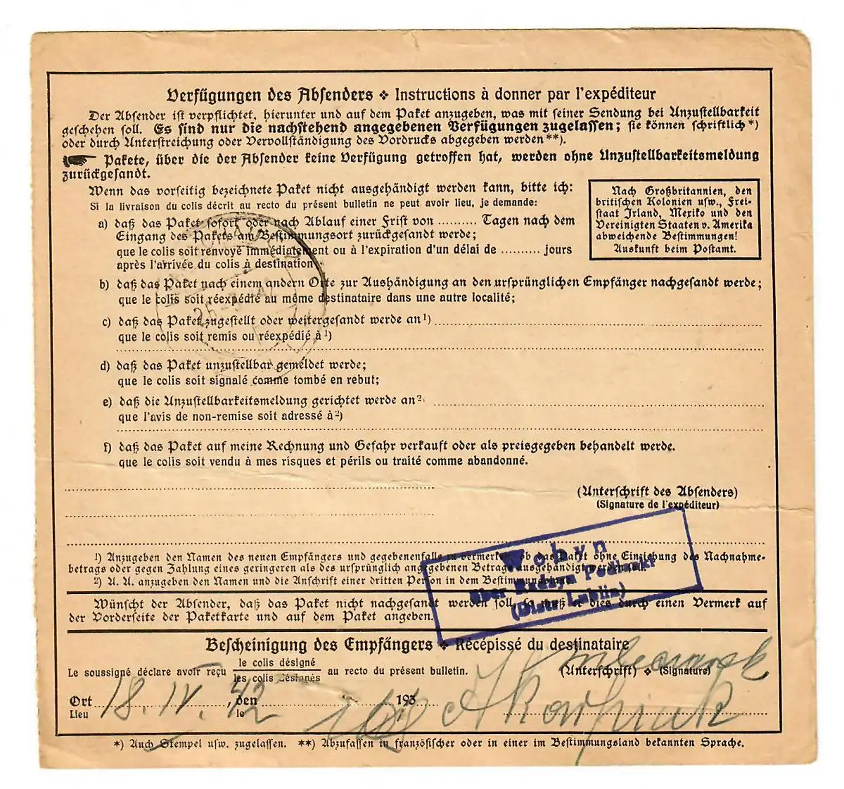 Carte colis international de Königshutte Oberschlesien vers Wobyn/Lublin avec cachet arrière de l'agence. Frais de douane. Pour plus d'informations voir l 'article Scan n° 954292 examen: original Numéro d article: 00000000954282