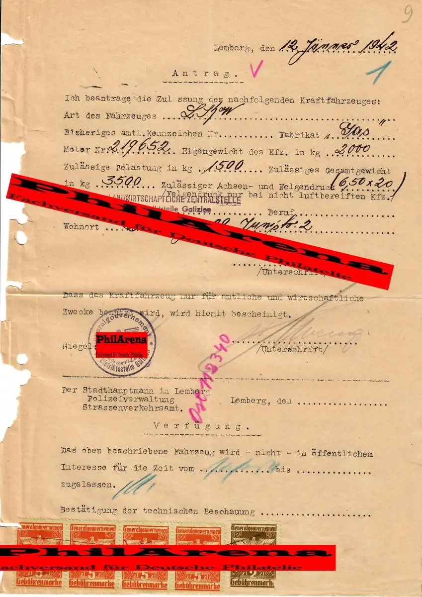 Gouvernement général GG: demande d'immatriculation d ' un camion GAZ, 1942