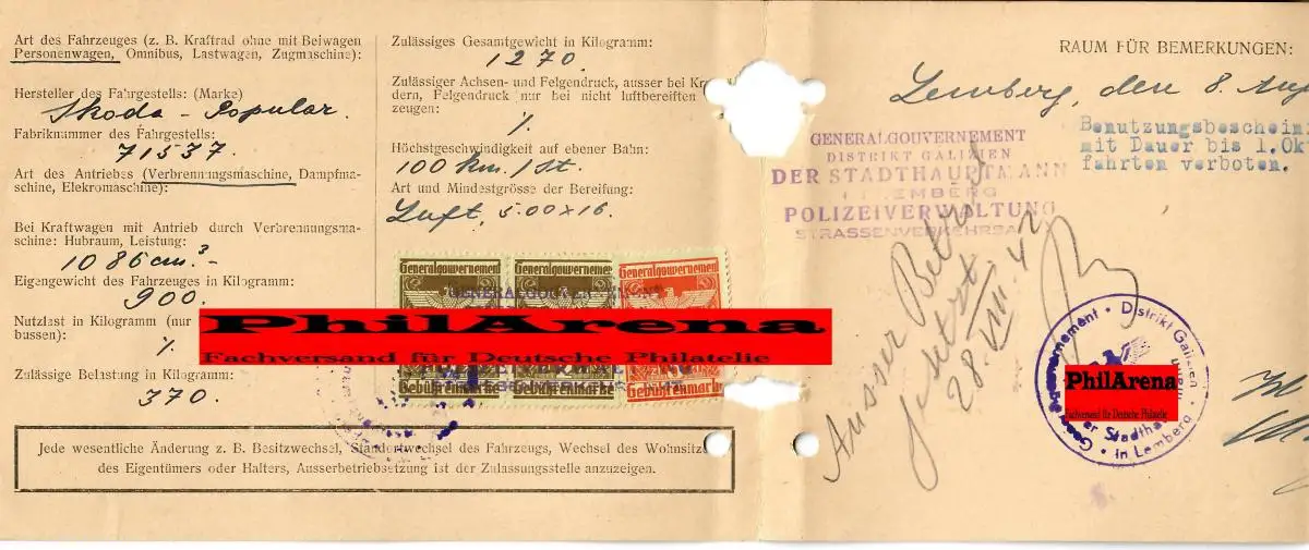 Gouvernement général GG: permis de conduire SKODA Popular de 1942