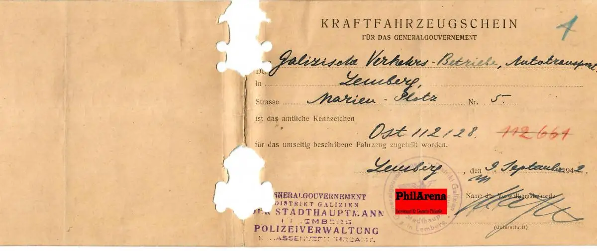 billet de voiture pour les compagnies de transport galicienne, transport de voitures (Galizien) à Lemberg. Marques de péage avec 9 zloty et autres commentaires. Trou d'immatriculation. Ce billet est resté chez l'entreprise, un deuxième billet voiture était sur le côté. Le billet automobile est plus grand que DIN A4, donc le scan est coupé. L'original est légèrement plus gros et non coupée. Pour plus d 'informations voir l . Scan article n° 954233 examen: original Numéro d & #395423