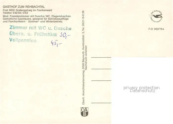 Grafengehaig Gasthof Zum Rehbachtal Restaurant Fremdenzimmer Grafengehaig postalisch nicht gelaufen nach 1965 Erhaltung siehe scans [FriedD77] Frierer
