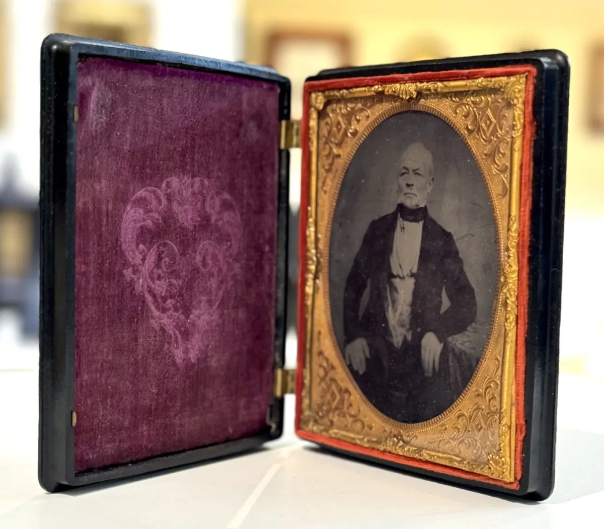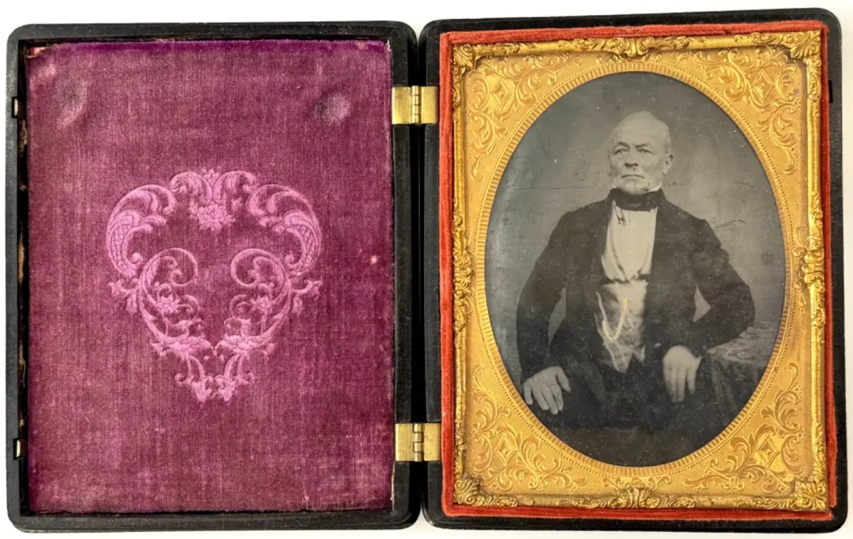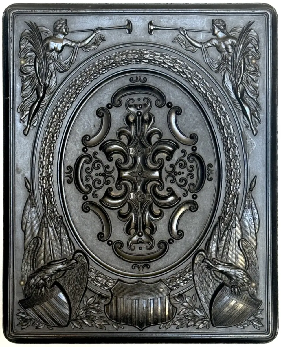 Fabriqué par S.Peck & Co. dans les années 1850, ce boîtier pour ambrotype ou daguerréotype est un modèle déposé par la société. Des scènes en relief sont moulées en bakélite et l'intérieur comporte d'un côté un morceau de velour gauffré et de l'autre, l'ambrotype serti de pinchbeck. Samuel Peck est le premier mouleur de plastique connu aux États-Unis.