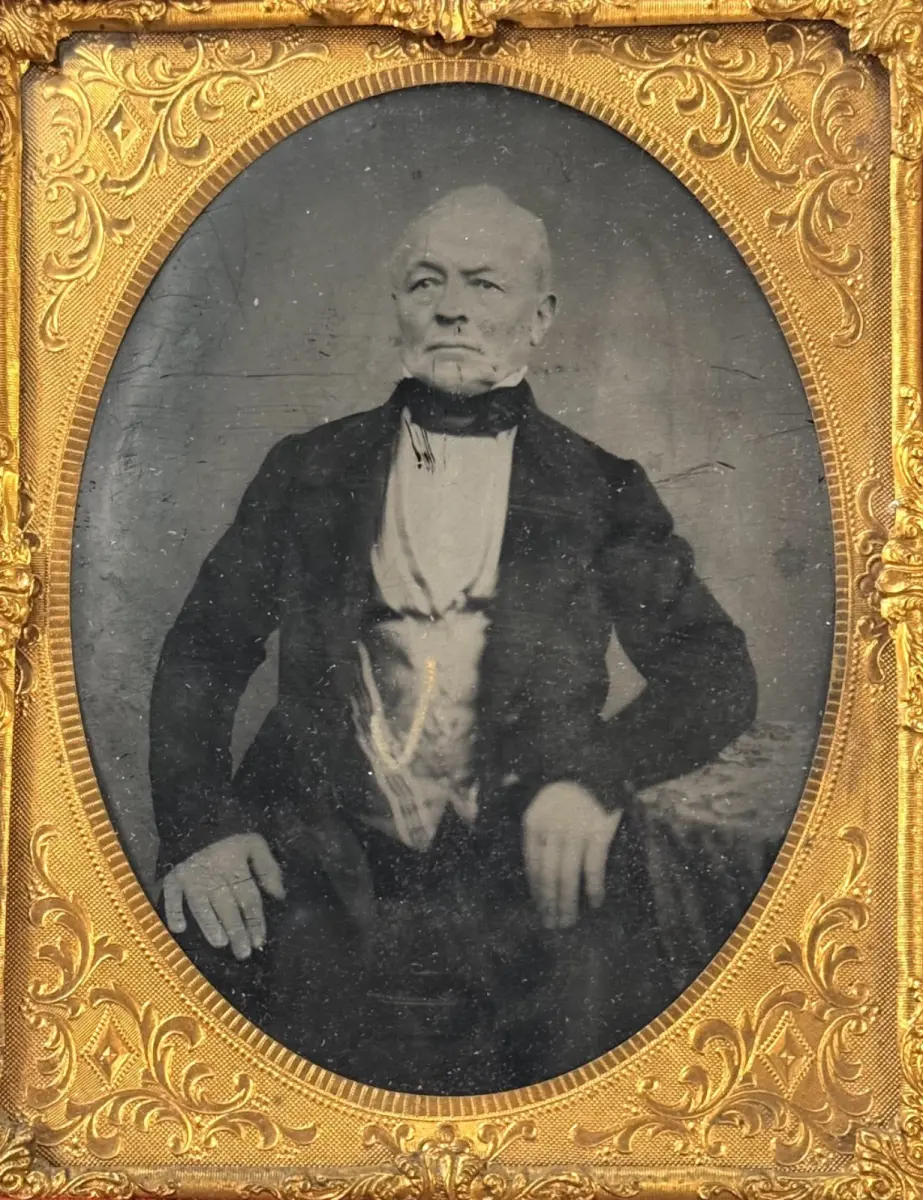 Ambrotype demi-plaque Portrait d'un homme de qualité dans un Union Case en Bakélite avec scène en relief.