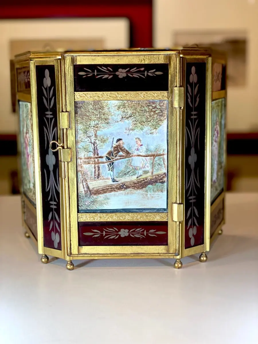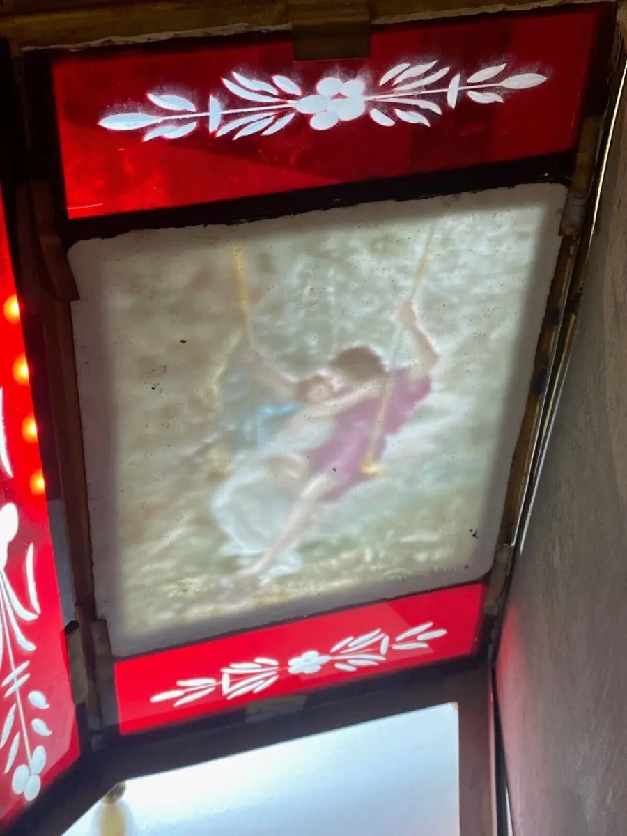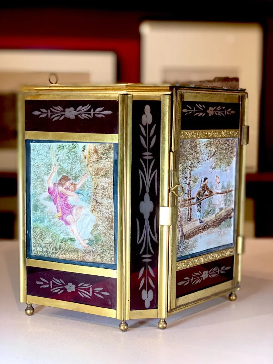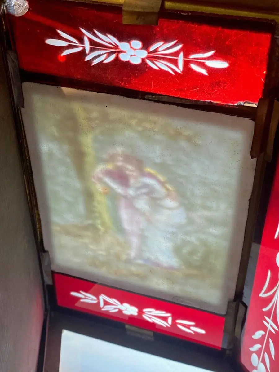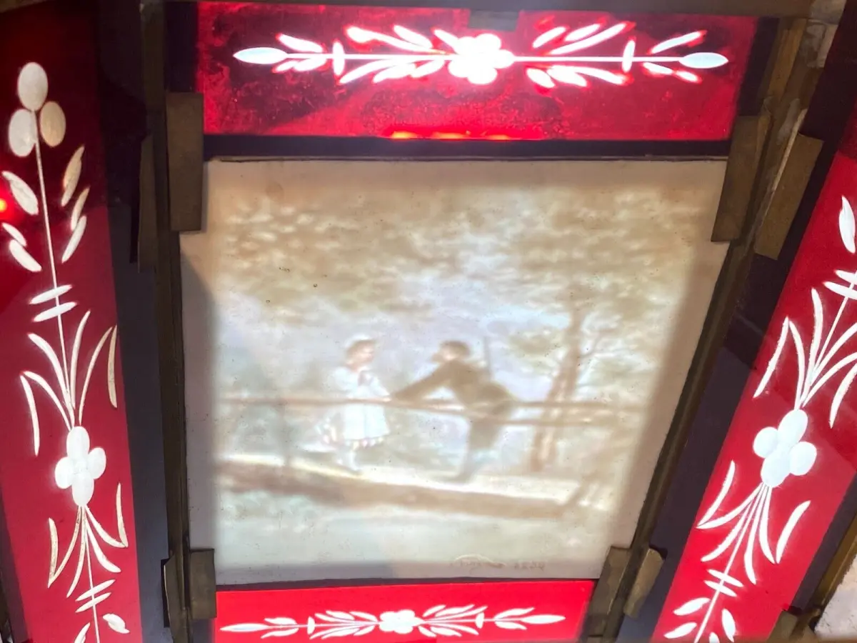 Rare lanterne en verre rouge pour 3 lithophanies , structure en laiton.
