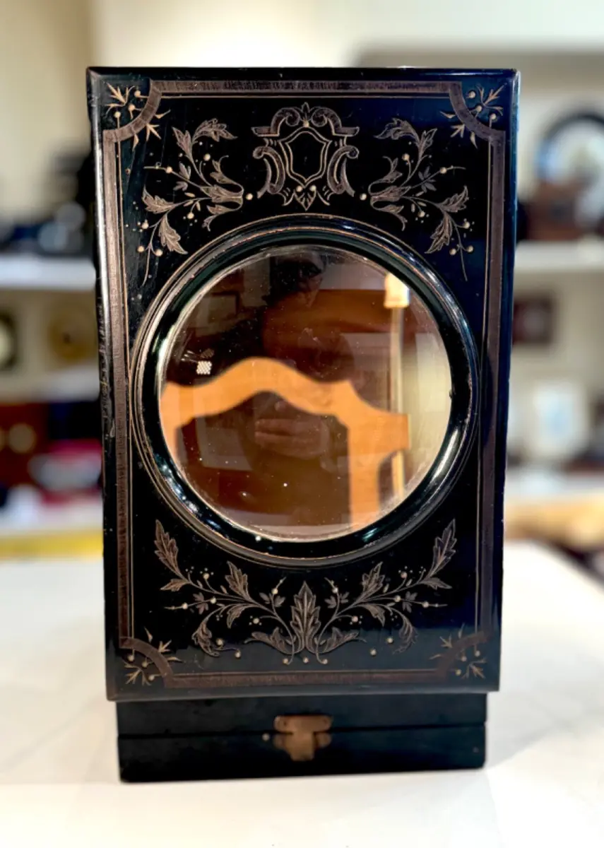 Grand et beau Graphoscope mono en bois noirci à décor de rinceaux et feuillages.