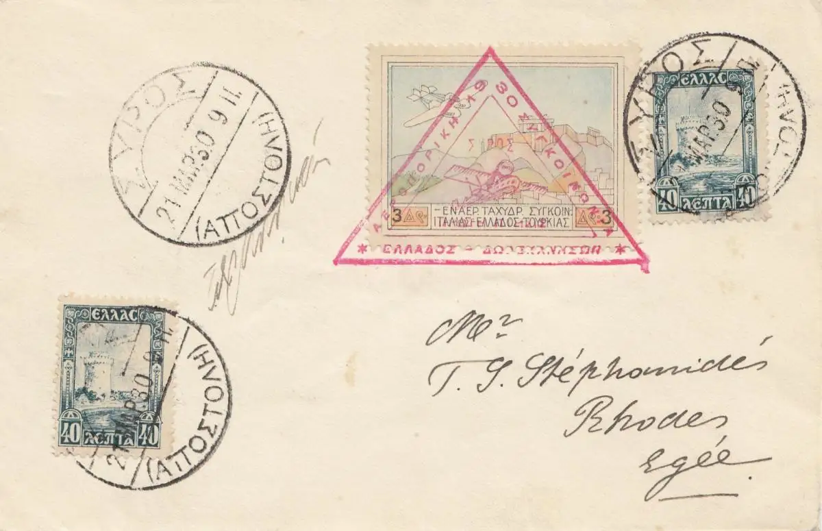 Grèce - Poste de vol Vignette-Stemple vers Rhodes 1930 SELTEN