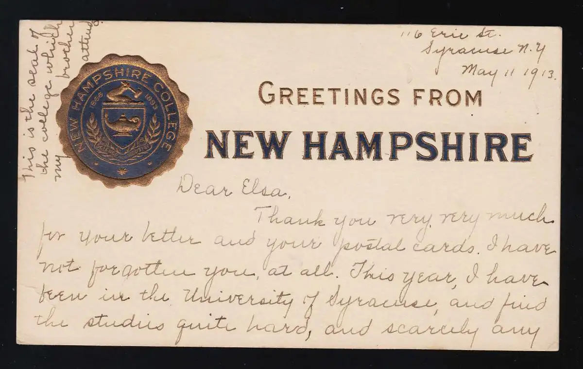 Greetings from New Hampshire College Wappen University, Syracuse 2.5.1913