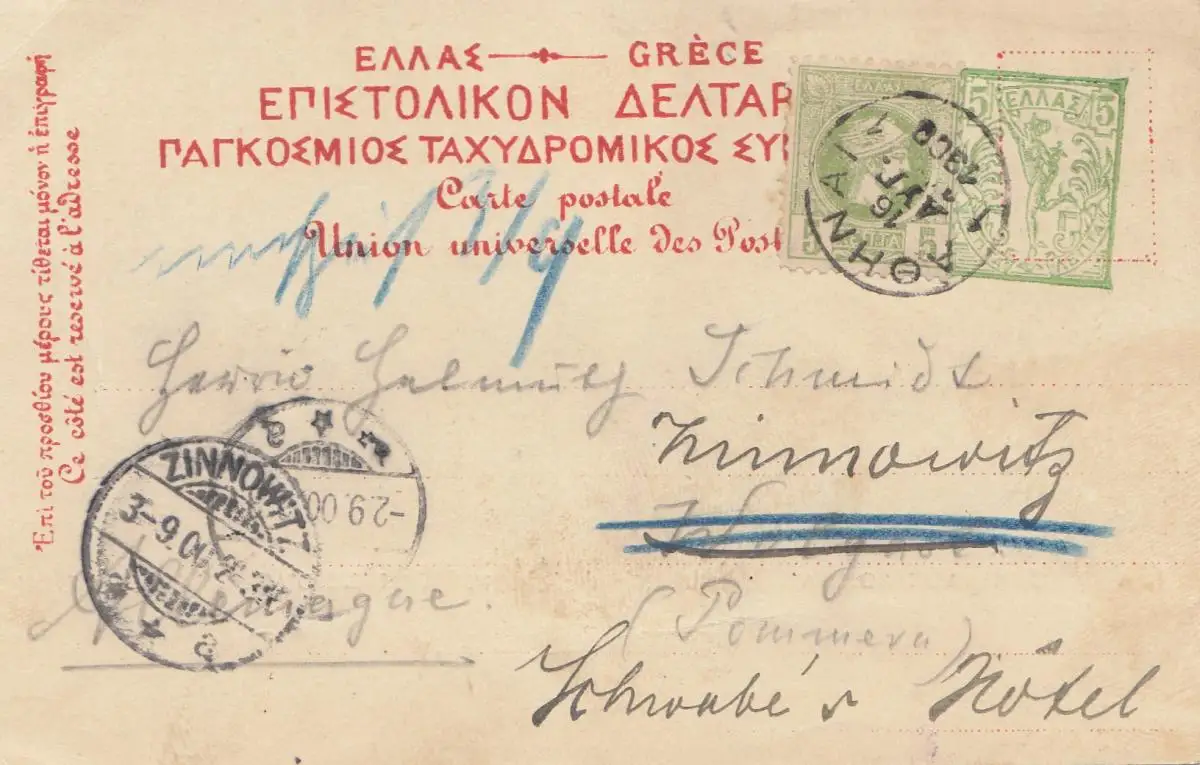 Grèce: 1900: Carte de vue après Pommern-Zinnowitz