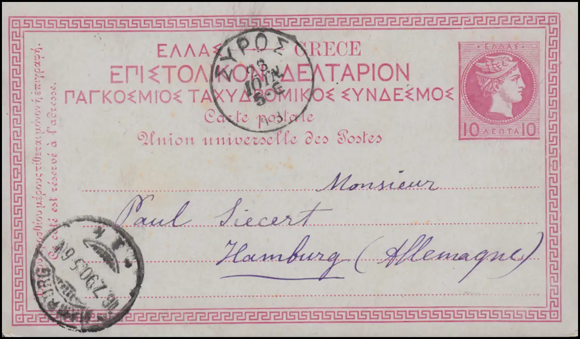Grèce Carte postale P 5 Hermes 10 L. karmin de SYROS 1890 à Hambourg