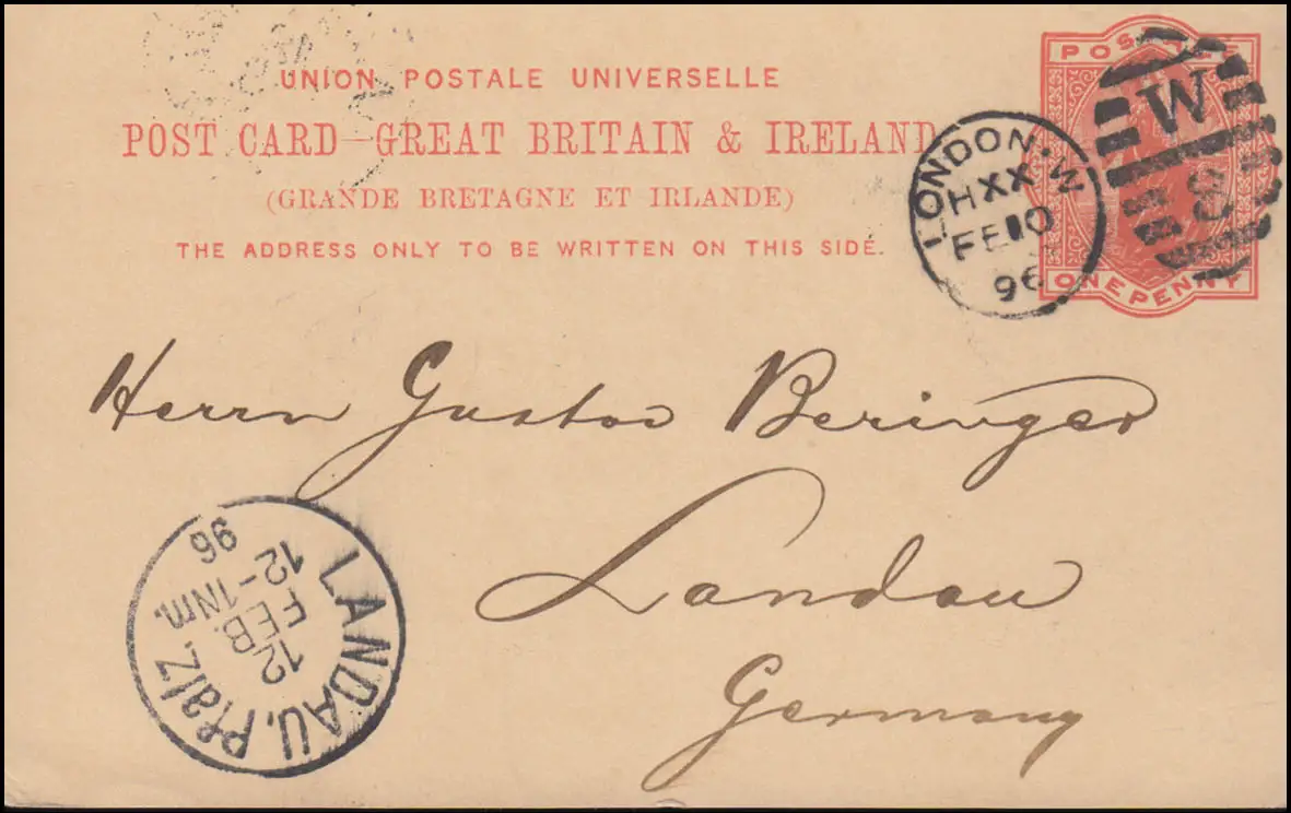 Royaume-Uni Carte postale P 26 DUP LONDON HXX - W 8 - 10.2.1896 selon LANDAU 12.2.