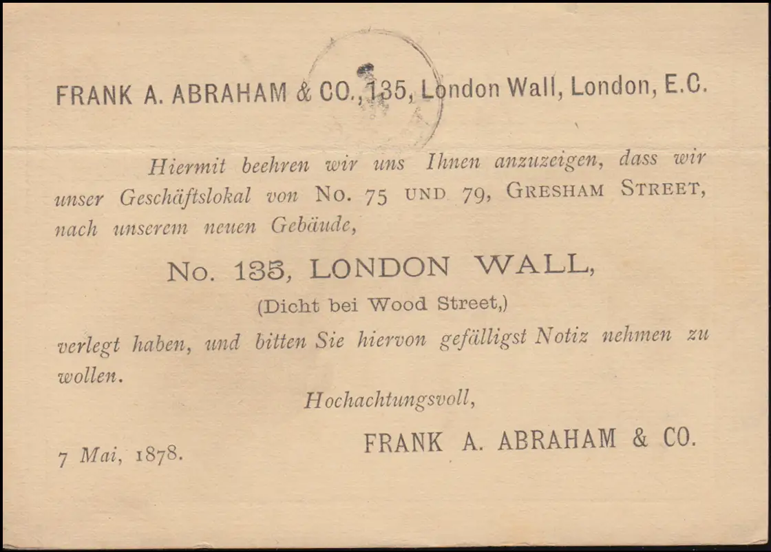 Royaume-Uni Carte postale P 4 Reine Viktoria DUP LONDON 27 AA - 8.5.1878