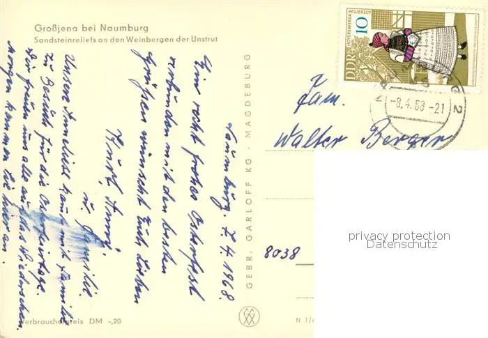 Grossjena Sandsteinreliefs an den Weinbergen der Unstrut Grossjena postalisch gelaufen 1968 Erhaltung siehe scans [WerneD78] WernPID7