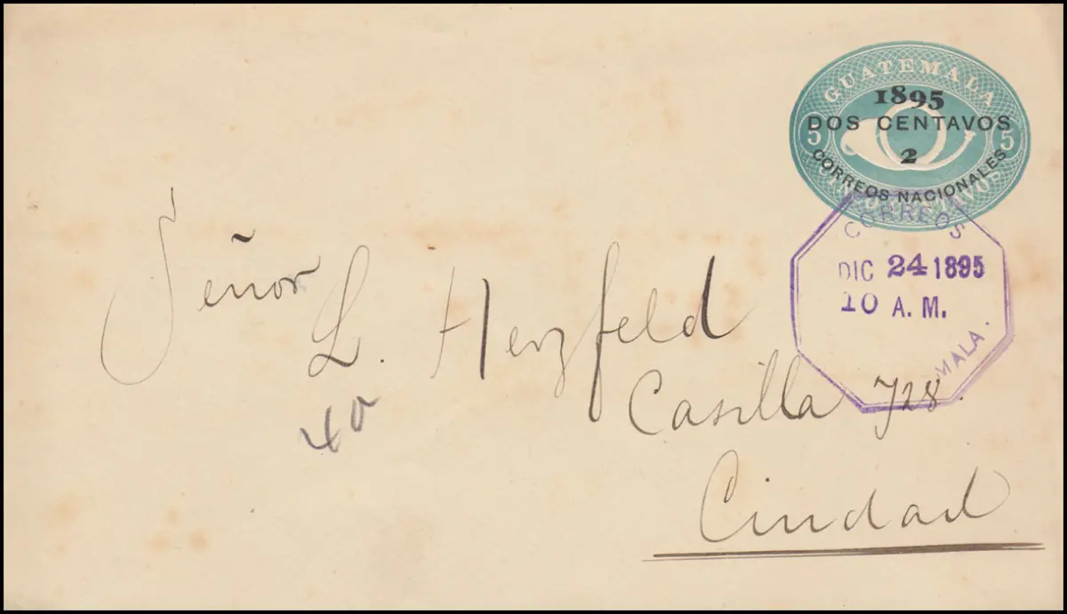 Guatemala Ganzsache Umschlag 5 C. Aufdruck, GUATEMALA 24.12.1895 nach Ciudad