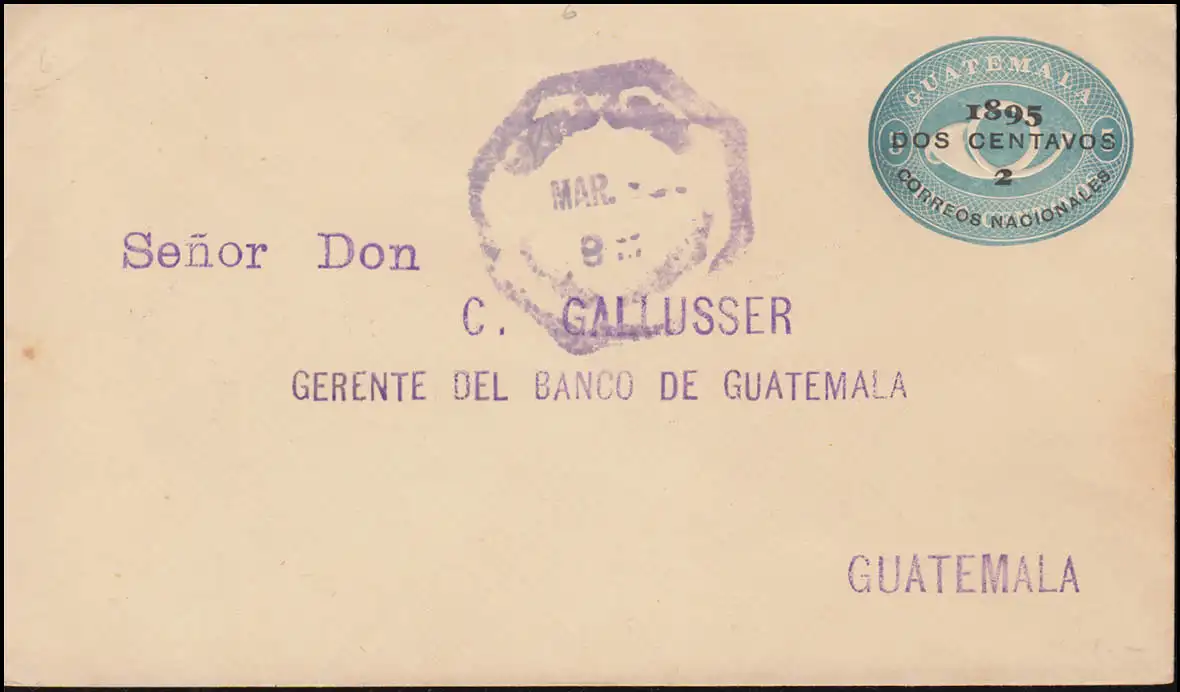 Guatemala couverture 5 cents, imprimée 2 cent. 1895 d'après GUATEMALA 13.3.1898