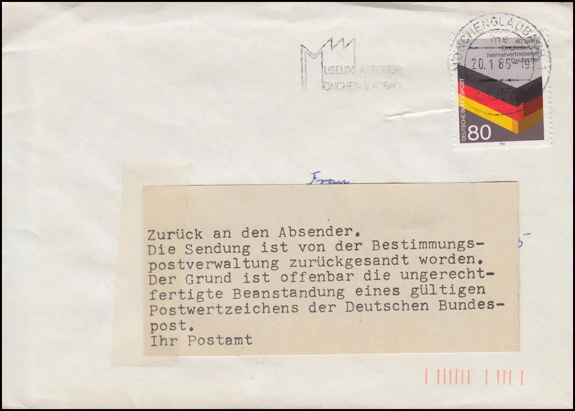 Guerre postale B.4.w 1265 Pk IV: Retour et notification Lettre 20.1.1986
