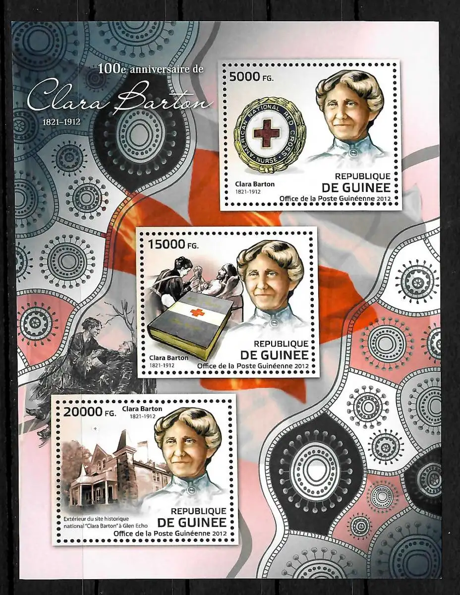 Guinée: 100 ans Clara Barton - Croix-Rouge, bloc de 3 timbres frais