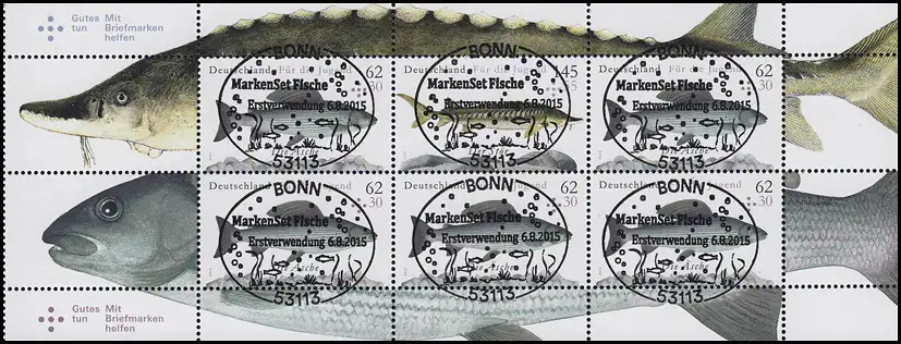 6 marques de poissons d'eau douce à colle humide: 5x Coussin (3169) et 1x Scher (3181) dans le coude à six, UNGEFALTET, par marque avec cachet d ' utilisation initiale "BONN MarkenSet Poissons Premier usage 6.8.2015" N° de catalogue: HBl49 Contrôle: original Numéro d\' article: 50063004901302