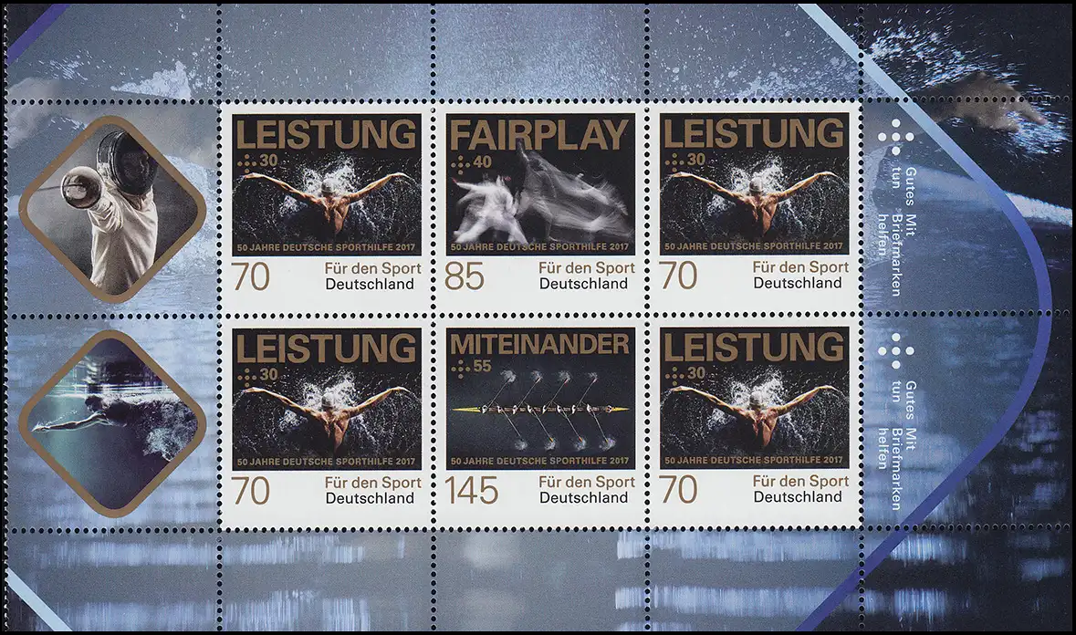 6 marques autocollantes Aide sportive (4 fois 3207 performances, 1 fois 3308 fairplay et 1 x 3309 ensemble) dans le goelet de 6 pièces, non plié Numéro de catalogue: HBl50 Examen: original Référence produit: 50063005001100