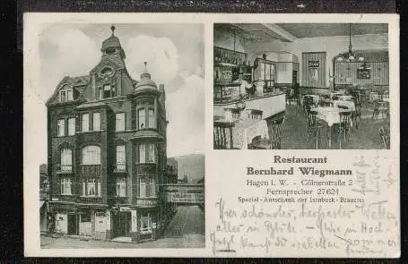 Hagen. Restaurant Bernhard Wiegmann - Gebraucht. 1926. (NPLZ 58000)