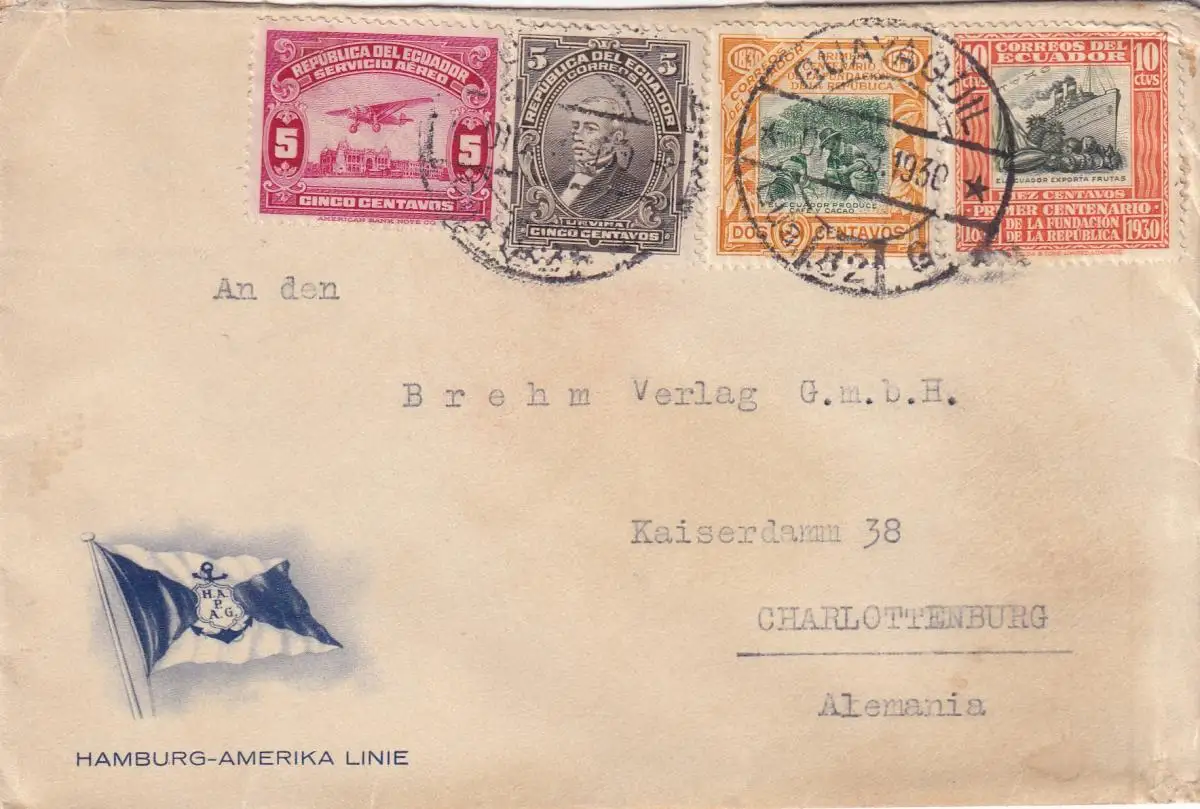 Hambourg Amérique Ligne: 1930 Quayaguil to Charlottenbug via S/S Spreewald