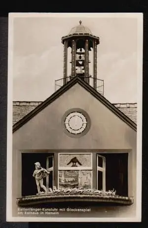 Hameln. Rattenfänger Kunstuhr mit Glockenspiel am Rathaus - Gelaufen. 1938. (NPLZ 31780) Posiadamy rowniez konto zlotowkowe w Polsce.