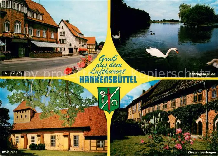 Hankensbuettel Hauptstrasse Isenhagener See Schwaene Kloster Isenhagen Kirche Hankensbuettel postalisch gelaufen 1987 Erhaltung siehe scans [FriedD77] Frierer