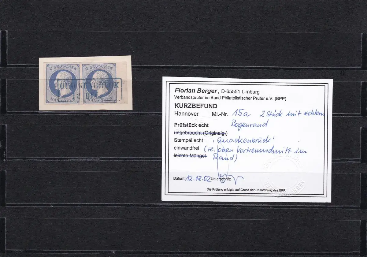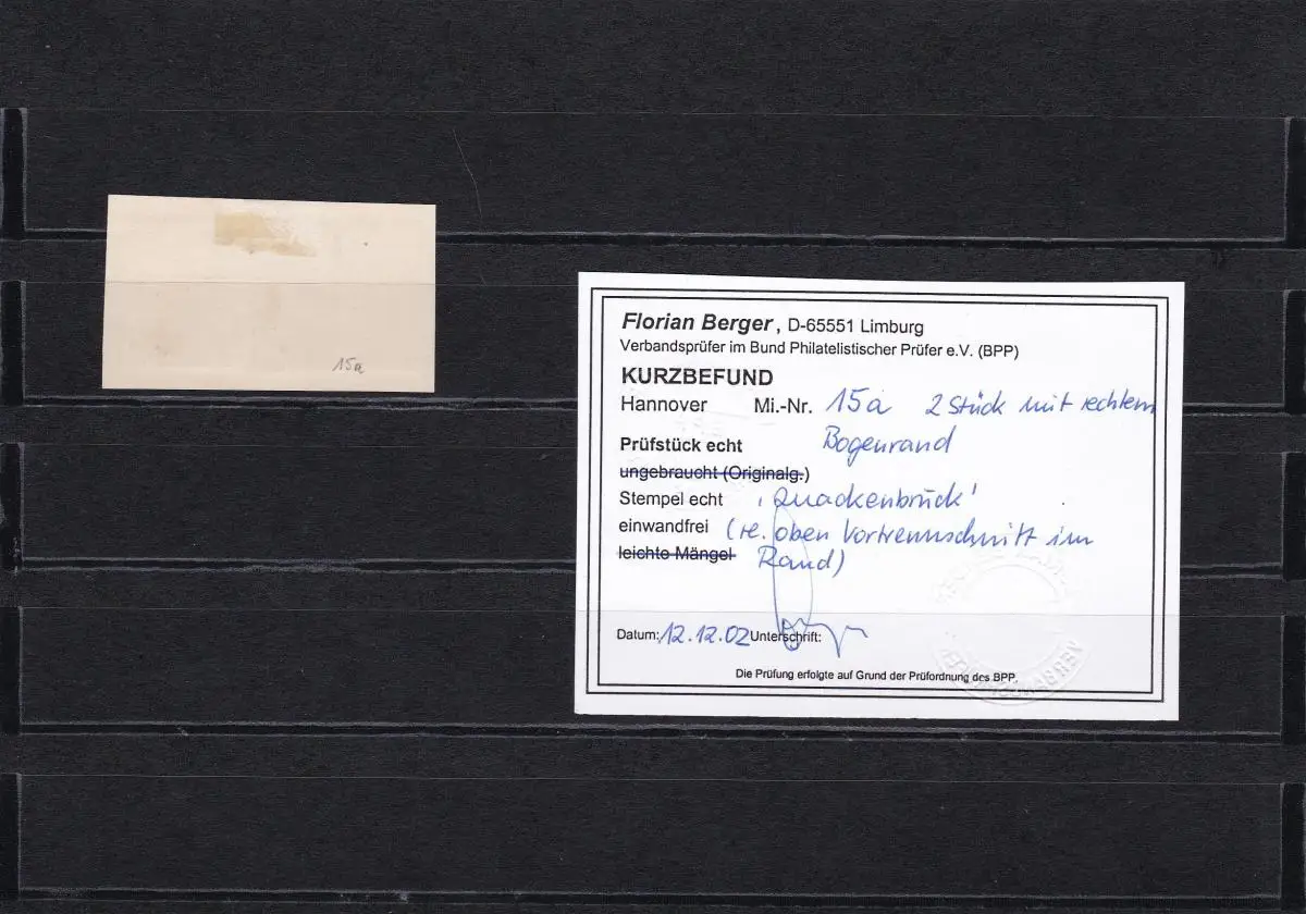 Hanovre: 2x MiNr. 15a, 1x bord latéral, tamponné, résultat BPP