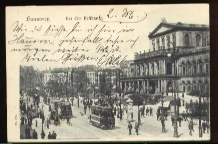 Hannover. Vor dem Hoftheater - Gelaufen 1902. (NPLZ 30000, Straßenbahn)