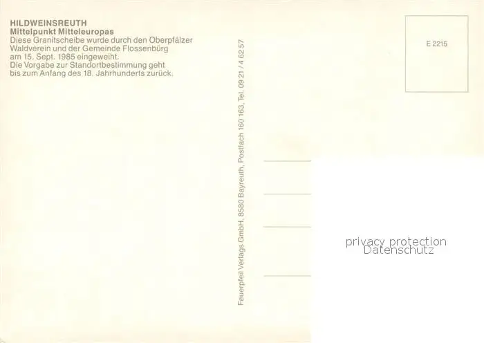 Hildweinsreuth Granitscheibe Mittelpunkt Mitteleuropas Hildweinsreuth postalisch nicht gelaufen nach 1965 Erhaltung siehe scans [FriedD77] Frierer