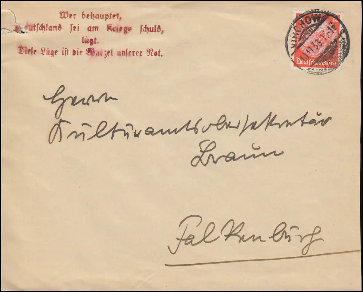 Hindenburg 12 Pf. EF sur lettre WIRCHOW 10.11.33 à Falkenburg avec propagande-O