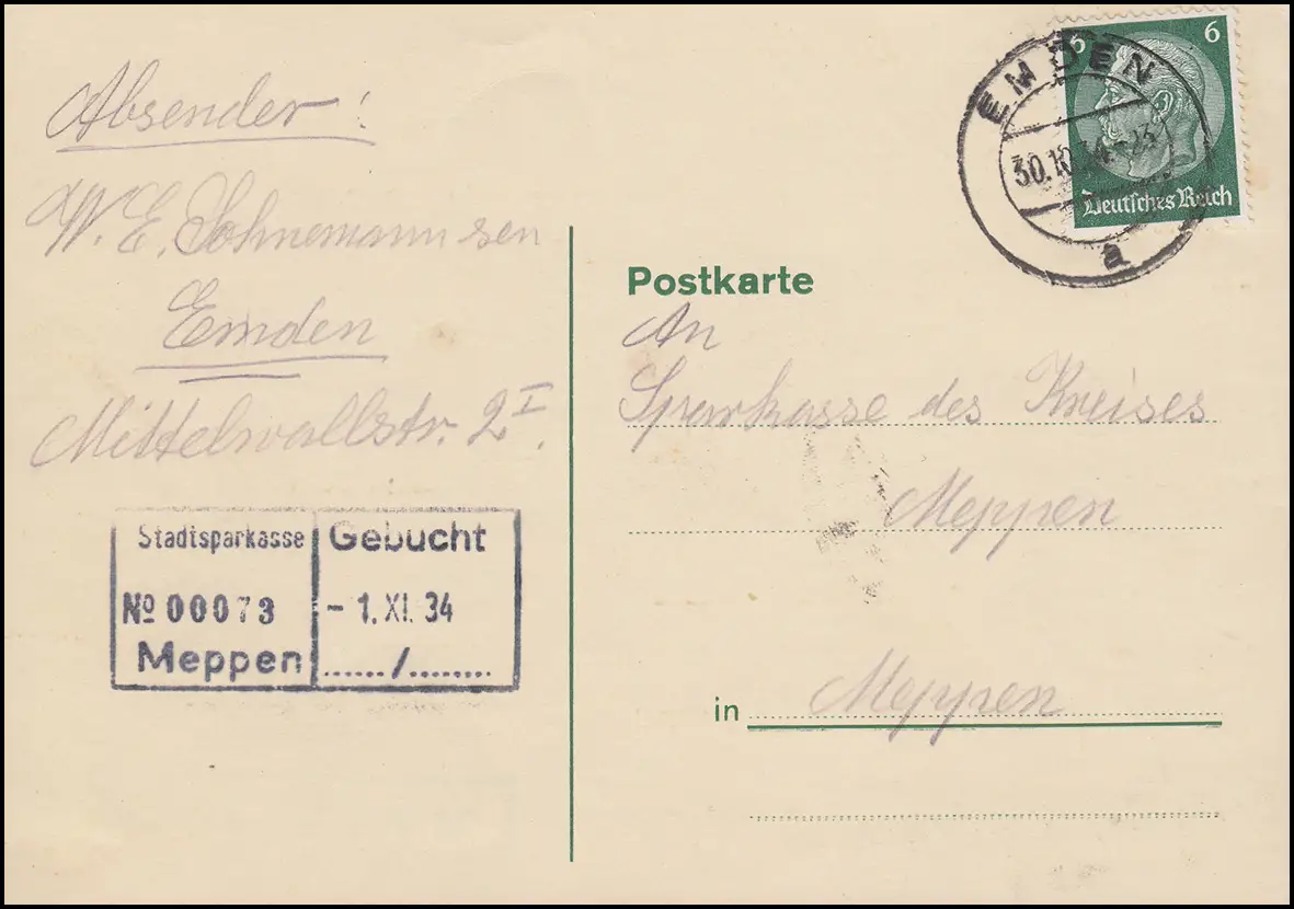 Hindenburg 6 Pf EF Carte postale EMDEN 30.10.34 vers Meppen Stadtsparkasse 1.9.34