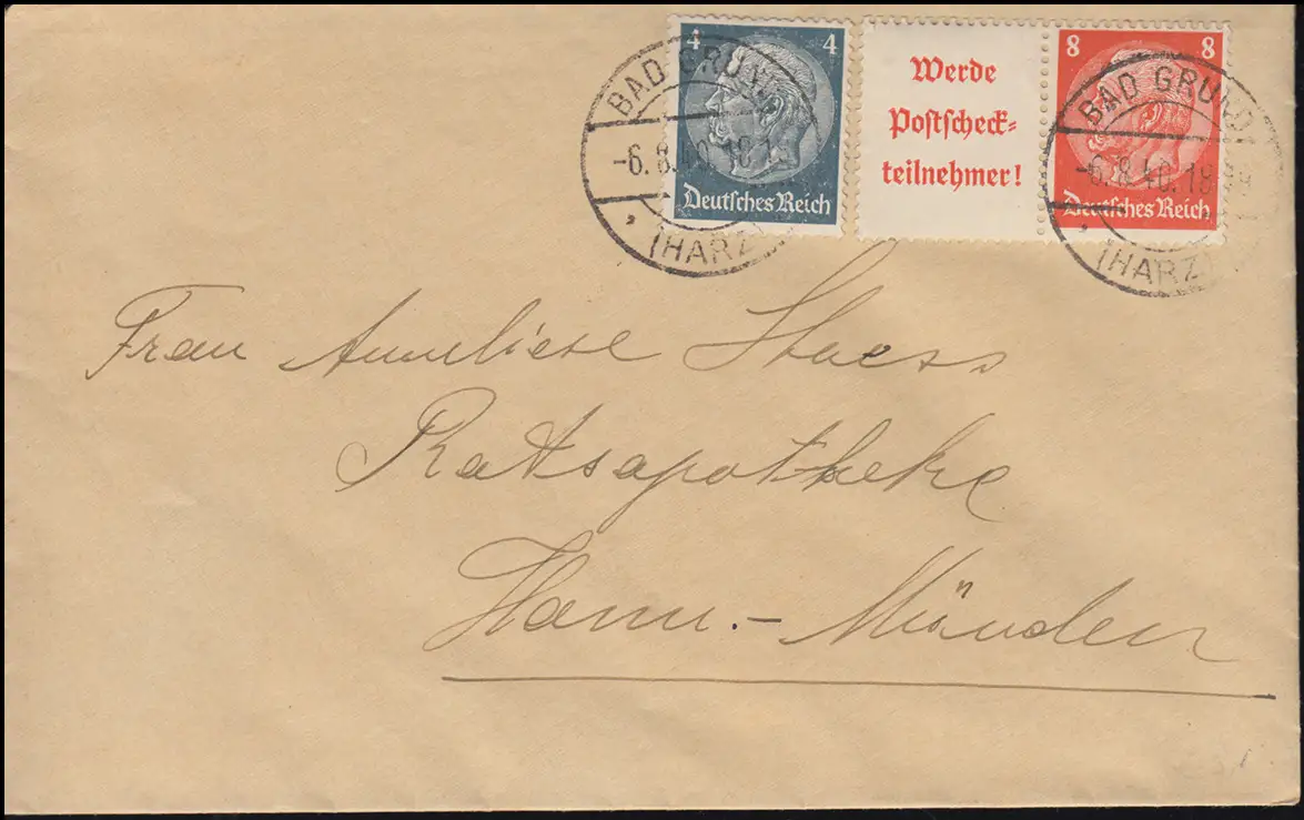 Hindenburg-ZD W 85 avec supplément approprié sur lettre BAD Grundt (HARZ) 6.8.140