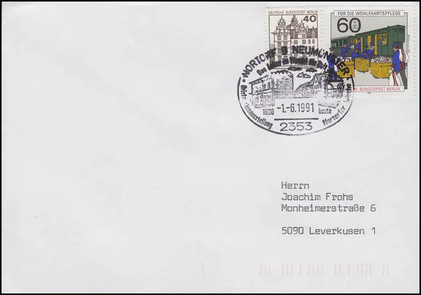 Histoire de la poste: courrier ferroviaire, lettre avec SSt Nortorf Vue de ville 1.6.1991