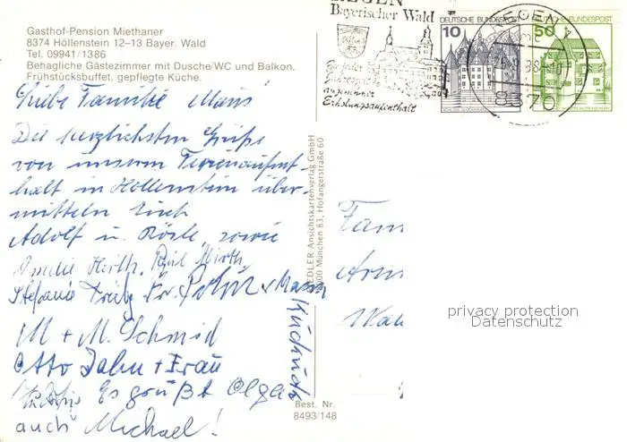Hoellenstein_Viechtach Gasthof Pension Miethaner Speiseraum Terrasse postalisch gelaufen 1980 Erhaltung siehe scans [WerneD78] WernPID7