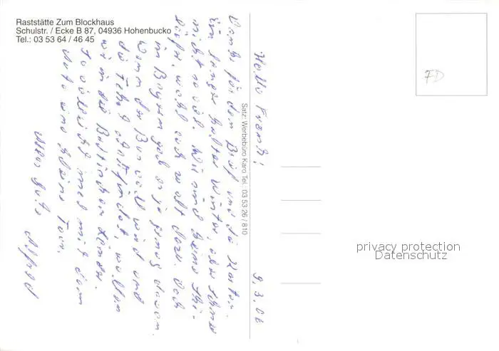 Hohenbucko Raststaette Zum Blockhaus Gaststube Terrasse Zimmer Hohenbucko postalisch nicht gelaufen 2006 Erhaltung siehe scans [WerneD78] WernPID7