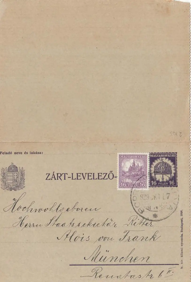 Hongrie: 1929: entier à Munich.
