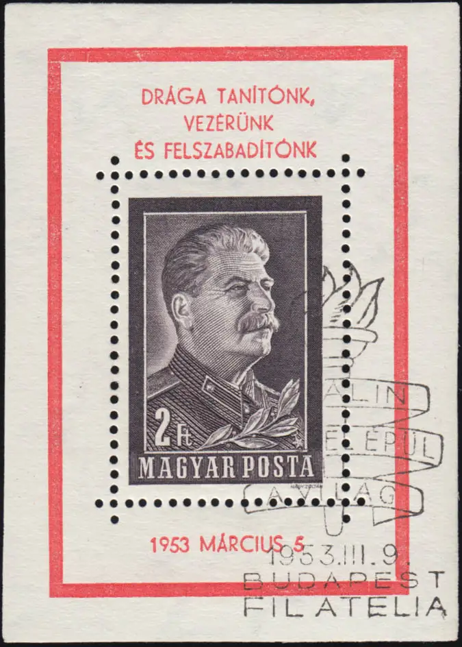 Hongrie: bloc 23 Mort de Staline avec le cachet spécial du premier jour BUDAPEST 9.3.1953