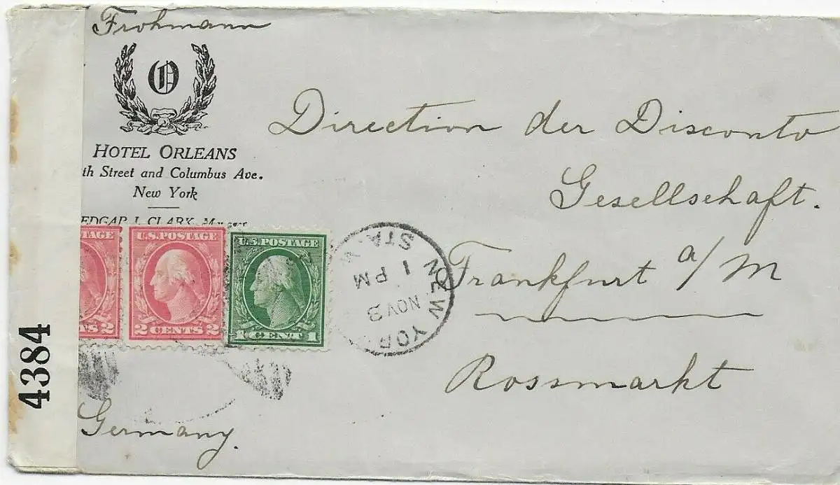 Hotel Orleans, New York to Frankfurt/M Germany, centorship
