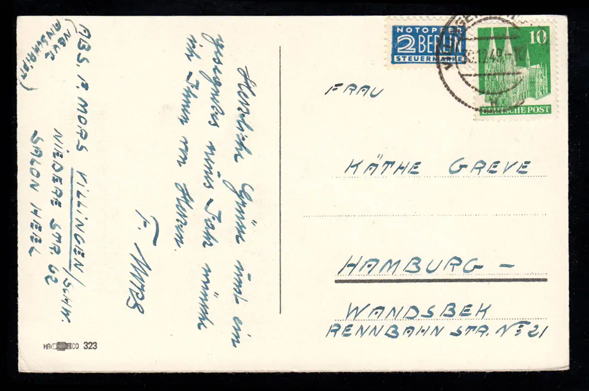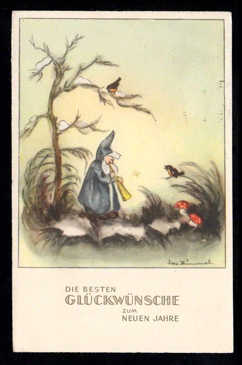 Hummel AK Nouvel An: Nain avec flûte dans le paysage hivernal, VILLINGEN 30.12.1949