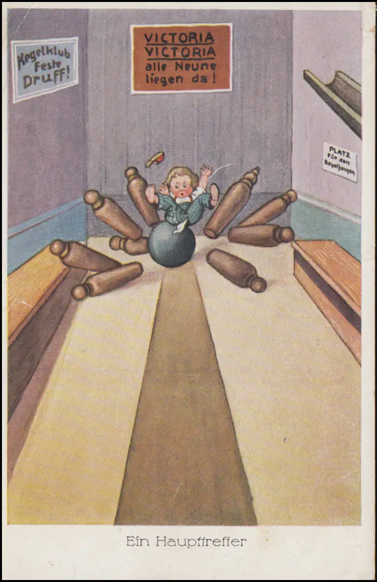 AK de l'humour Un coup principal: enfant avec balle en bowling, EINBECK 1.6.1923