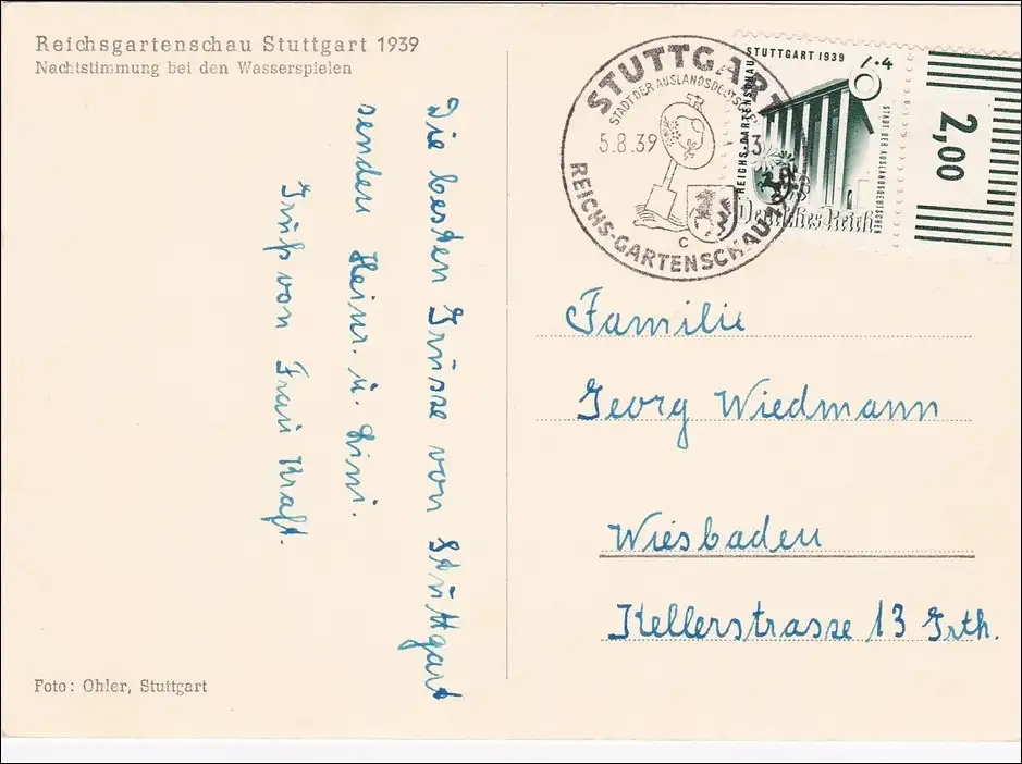 III. Reich: Carte de vue Regelsgartensau Stuttgart 1939
