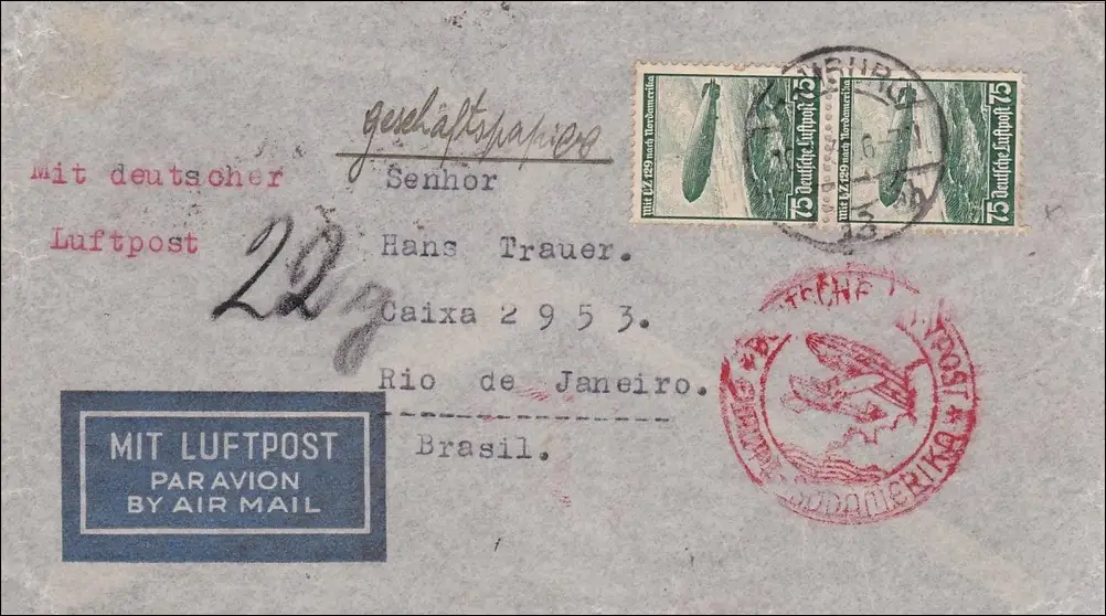 III. Reich: Lettre postale aérienne Hambourg - Brésil avec dirigeable Zeppelin 1936, MeF