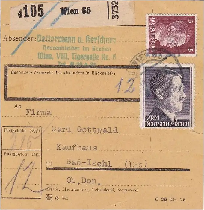 III. Reich: Carte de colis de Vienne à Bad Ischl 1944