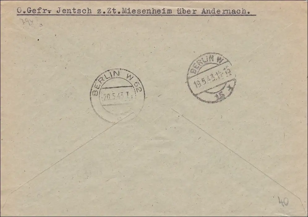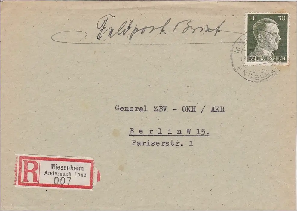 III. Reich: lettre recommandée courrier de champ-R-Taxe payé par Miesenheim 1943