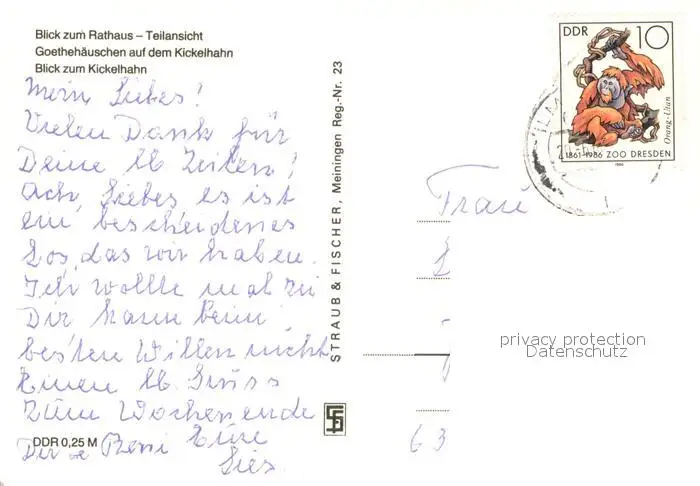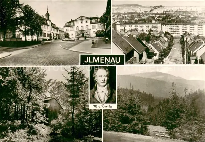 Ilmenau_Thueringen Blick zum Rathaus Stadtpanorama Goethehaeuschen auf dem Kickelhahn Portrait Johann Wolfgang von Goethe Ilmenau Thueringen postalisch gelaufen 1986 Erhaltung siehe scans [FriedD77] Frierer